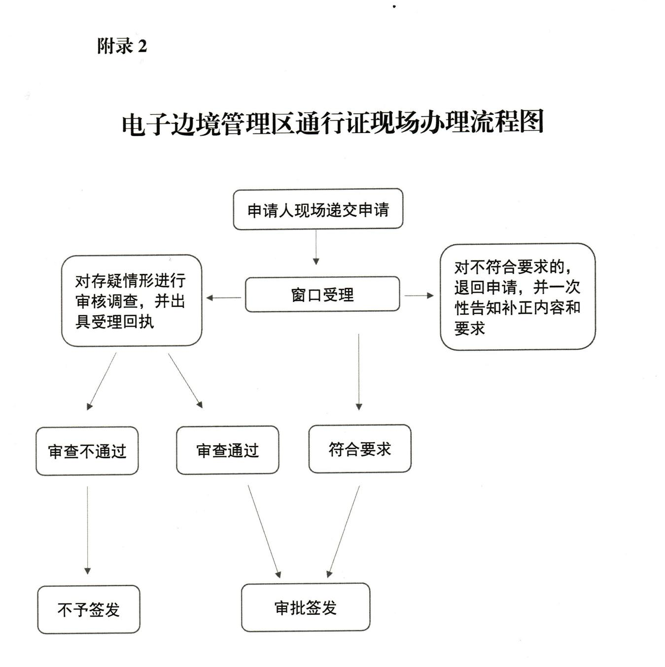 (二)现场申请。申请人须填写《电子边境管理区通行证申请表》,提供相关申请材料。经审核,申请材料齐全且符合法定形式的,当场签发电子边境通行证。申请人不符合条件、申请材料不齐全或者不符合法定形式的,一次性告知申请人不予受理的理由或者需要补正的全部材料和要求。对需要进一步审核调查的,向申请人出具《受理电子边境管理区通行证申请回执单》。签发机关根据审核调查结果,作出批准或者不予批准的决定。