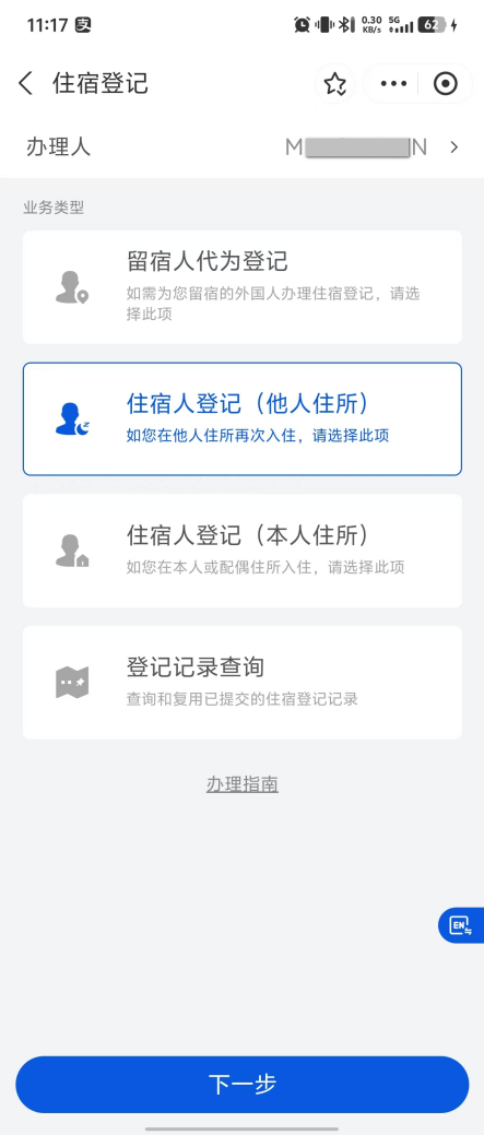 如留宿人曾通过国家移民局政务服务平台为您在当前住址代办住宿登记,再次登记时,您可点击“住宿人登记(他人住所)”,并按照以下步骤操作。