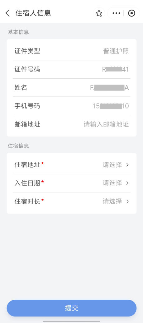1.住宿地址。您可复用留宿人曾代为办理住宿登记时保存的历史地址。