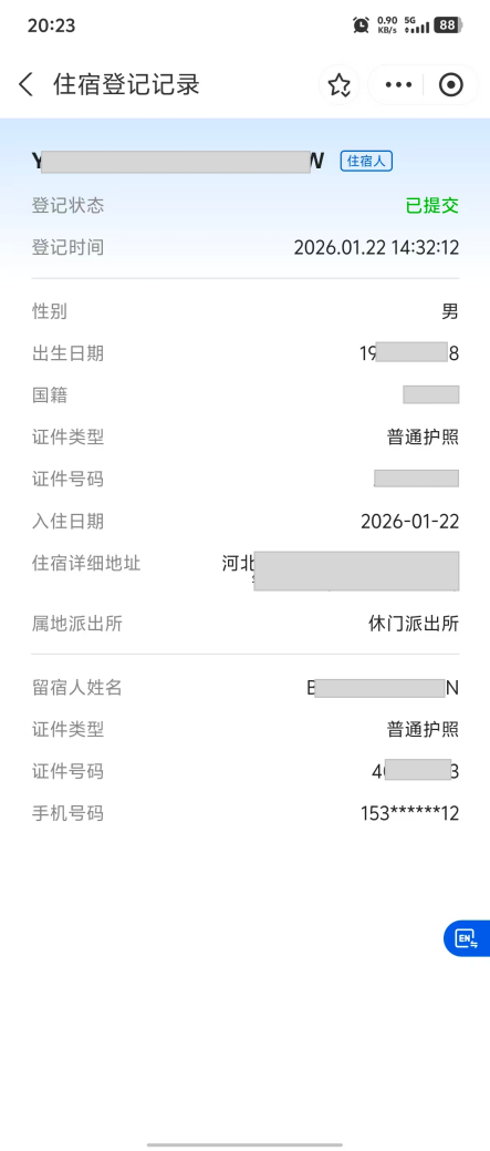 系统将自动回填住宿人证件类型、证件号码、英文姓、性别、出生日期、国籍、住宿地址等7项信息。需手动填写入住日期、住宿时长和住所性质等3项信息。有红色标志的选项为必填项,其他为选填项。