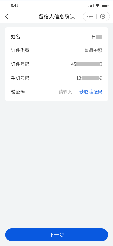 ①如您为留宿人,请确认您的信息,如信息无误,请点击“获取验证码”,输入验证码后,点击【下一步】进入“住宿人信息”页面。如需修改留宿人信息,请返回国家移民局政务服务平台首页,点击“我的”,进入“个人资料”页面进行变更。